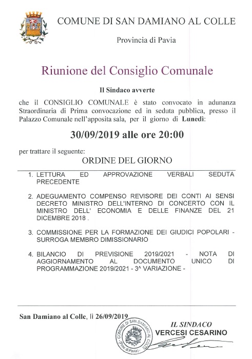 In allegato l'ordine del giorno della prossima seduta del Consiglio Comunale.